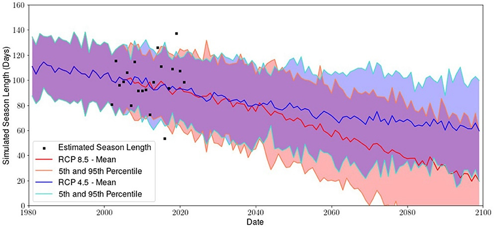 This work blossomed into a wonderful — albeit extended — collaboration with Liz Burakowski, Graham McDowell, and Taylor Luneau. We evaluated the historical impacts of warmer winters on ice climbing in the Mount Washington Valley (using Al Hosper’s amazing archive of repeat photography, NEClimbs.com, coupled with historical meterological data from the Pinkham Notch observation station) and simulated the likely impacts of future warming on ice climbing season length. We also conducted a survey and focus group with stellar local guides to assess the impacts of warmer and colder winters on guide and client experience, and assess guides’ adaptive capacity under a future of generally warmer winters.